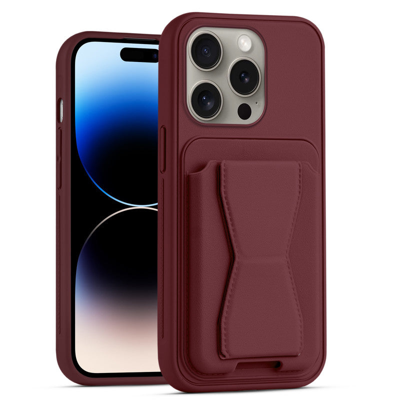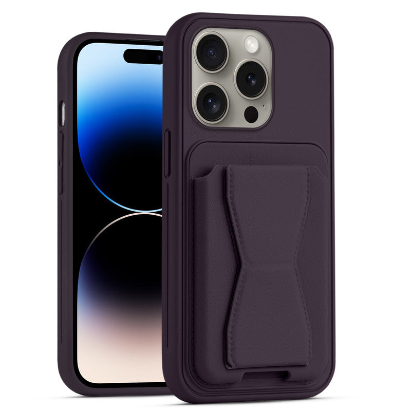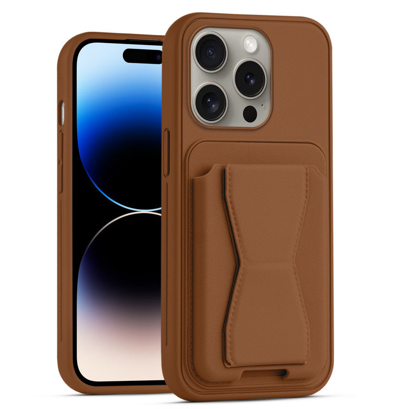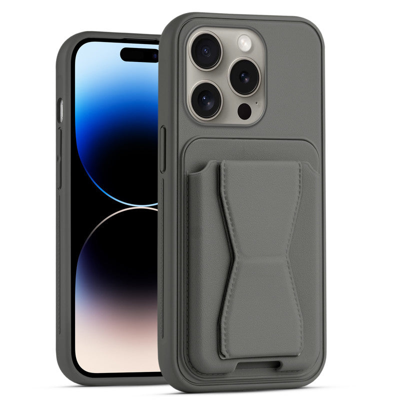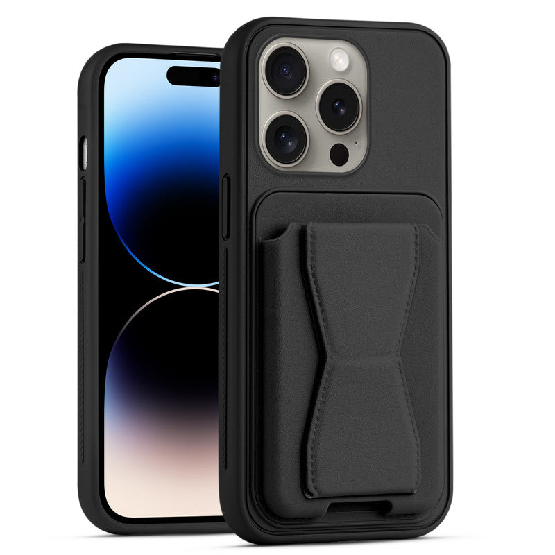 All in One Premium Leather Back Cover for Apple iPhone 14 Pro with Card Slot & Foldable Grip Holder