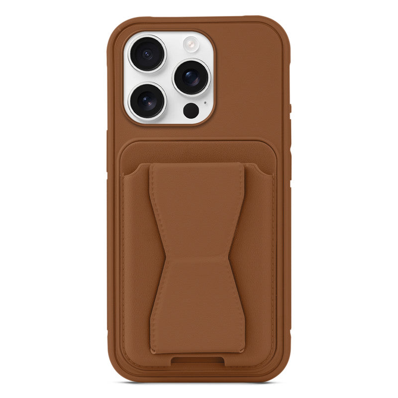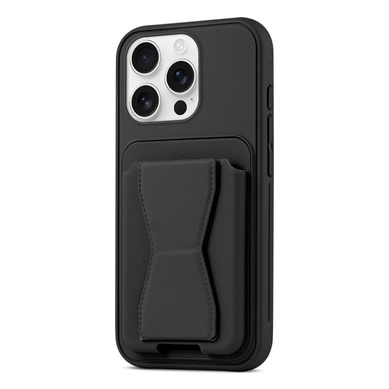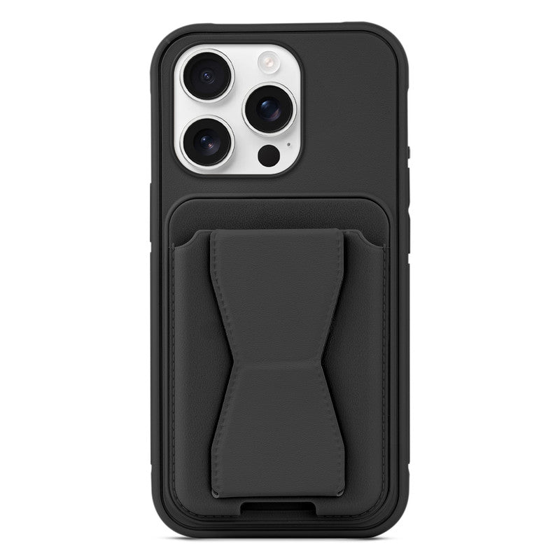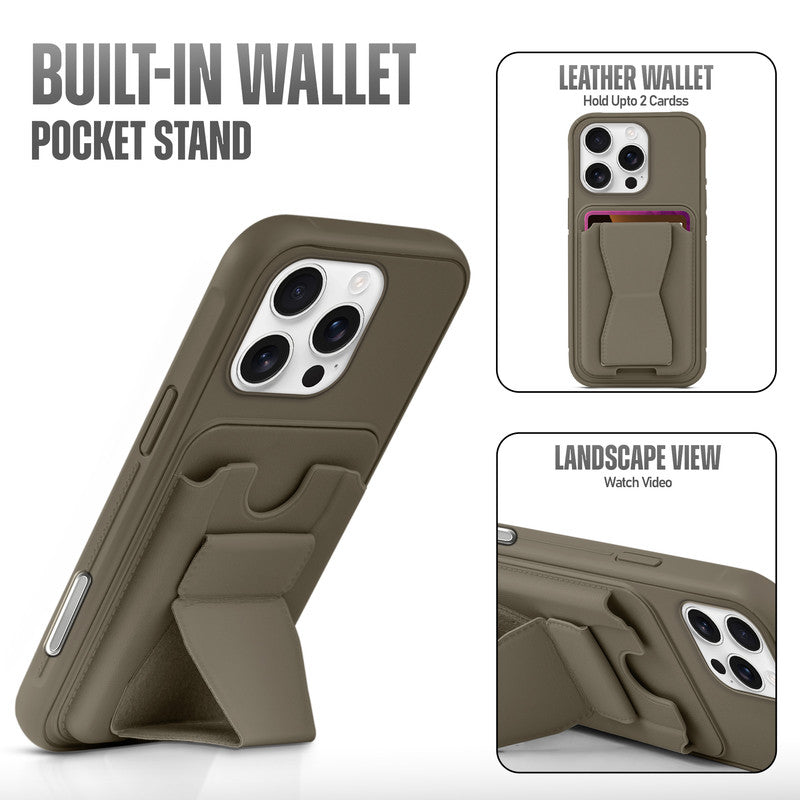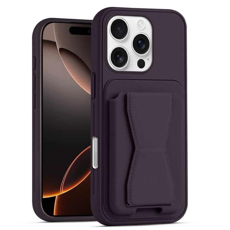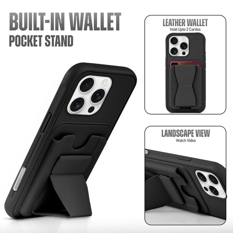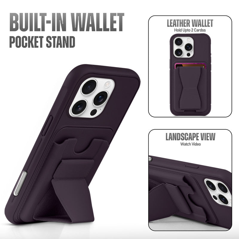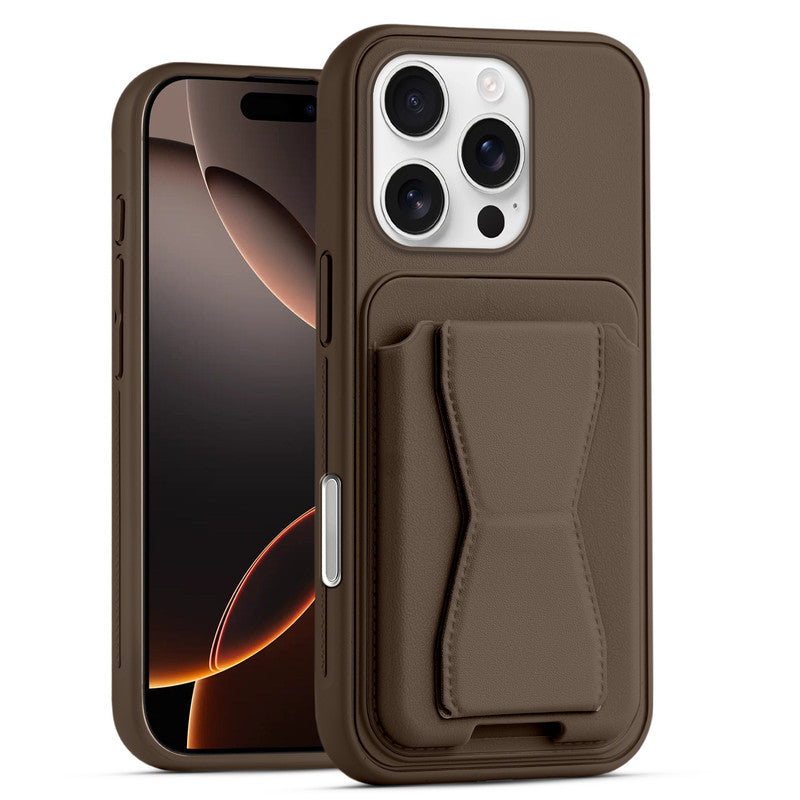 All in One Premium Leather Back Cover for Apple iPhone 16 Pro with Card Slot & Foldable Grip Holder