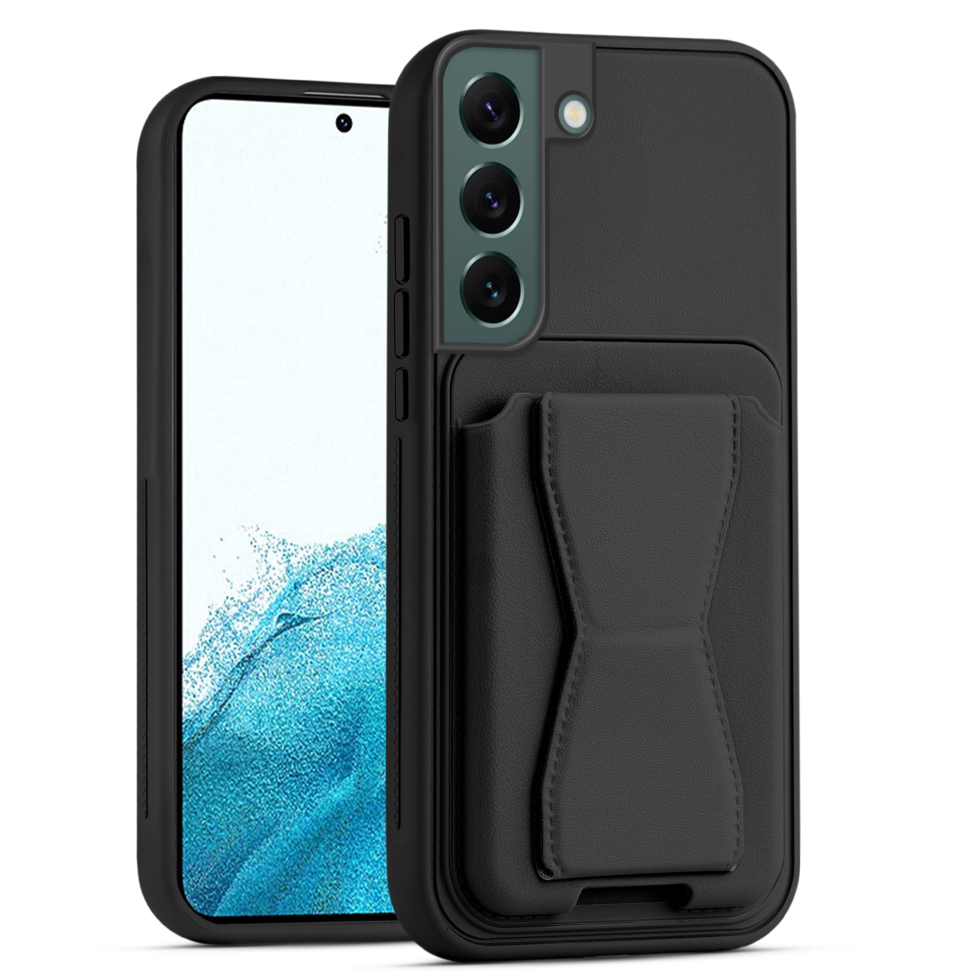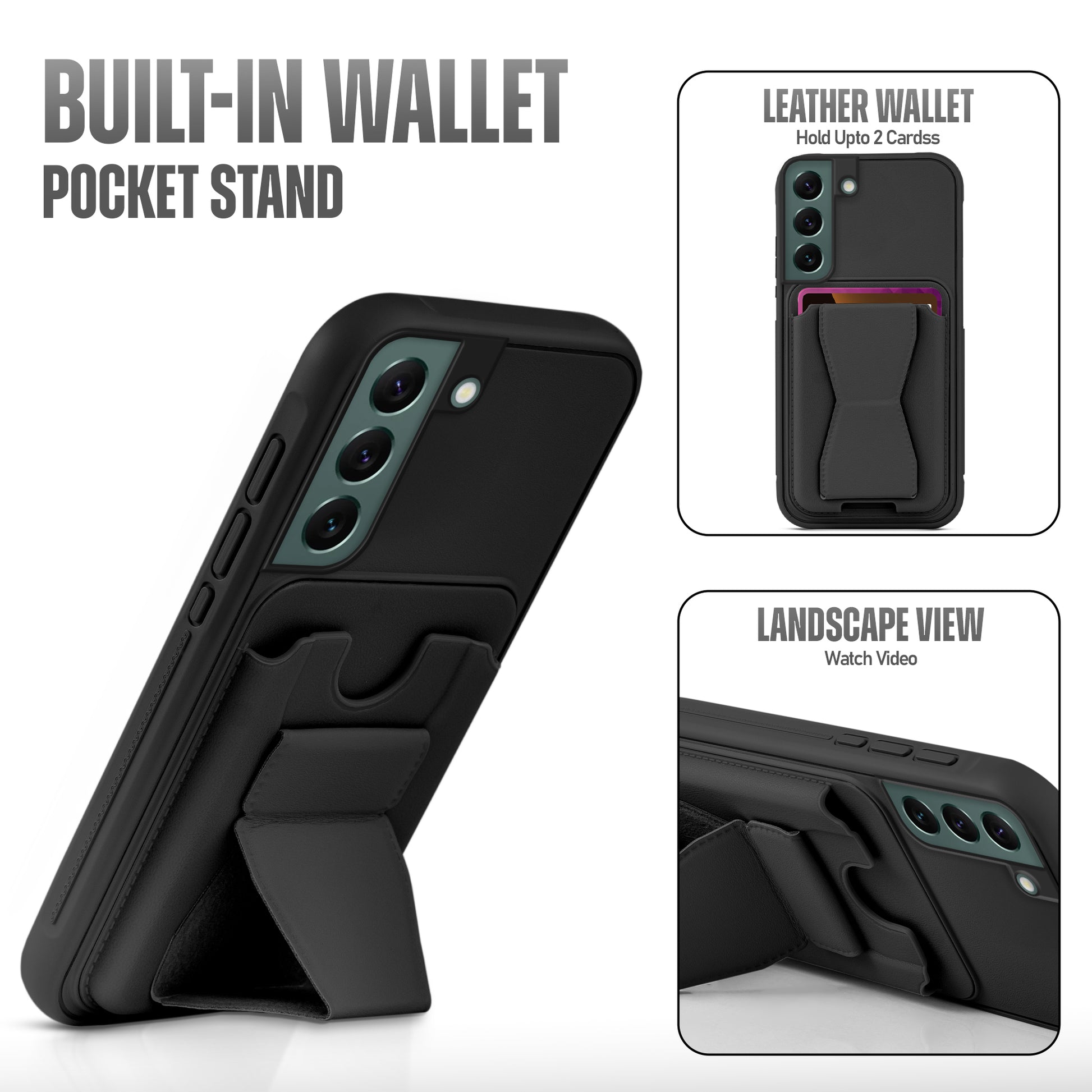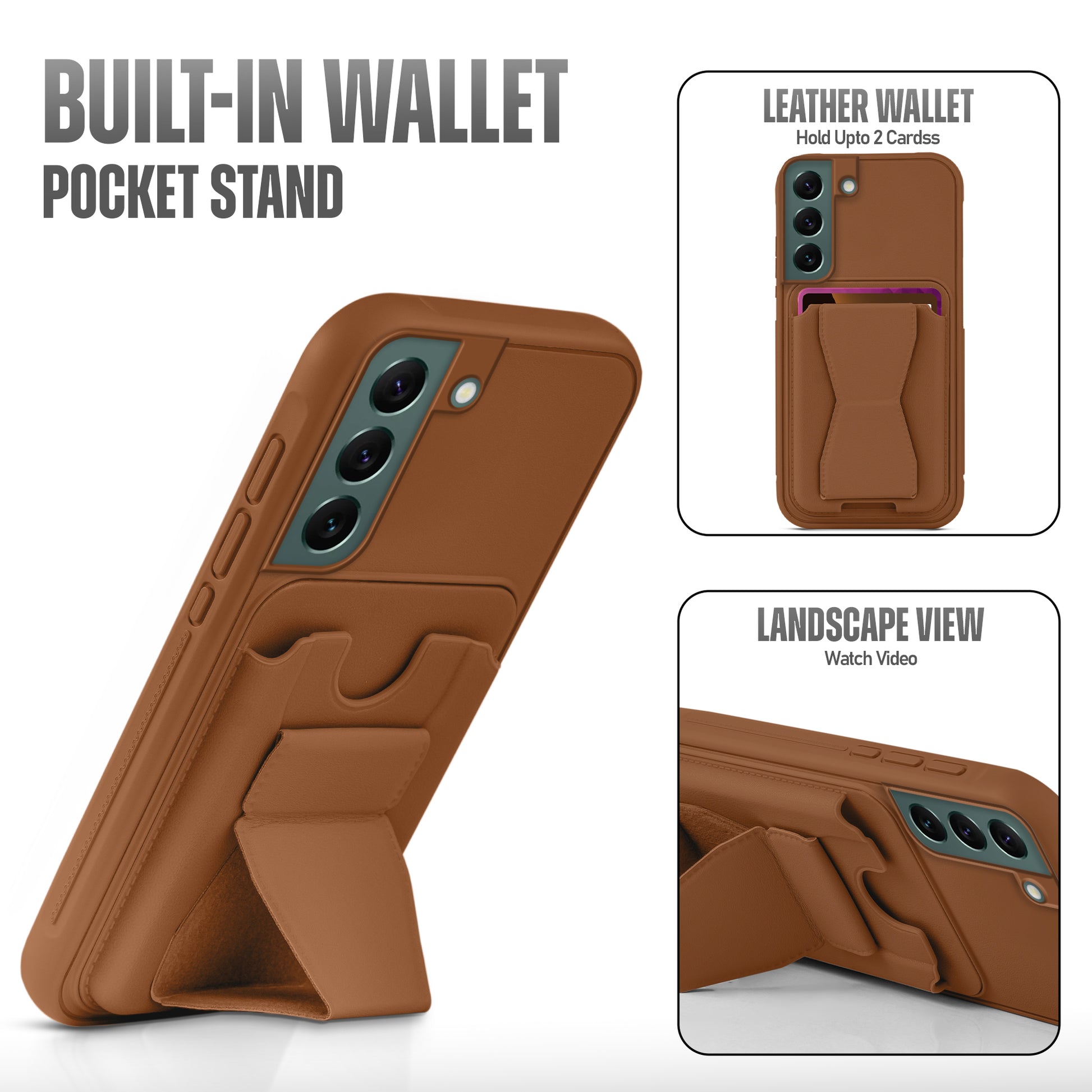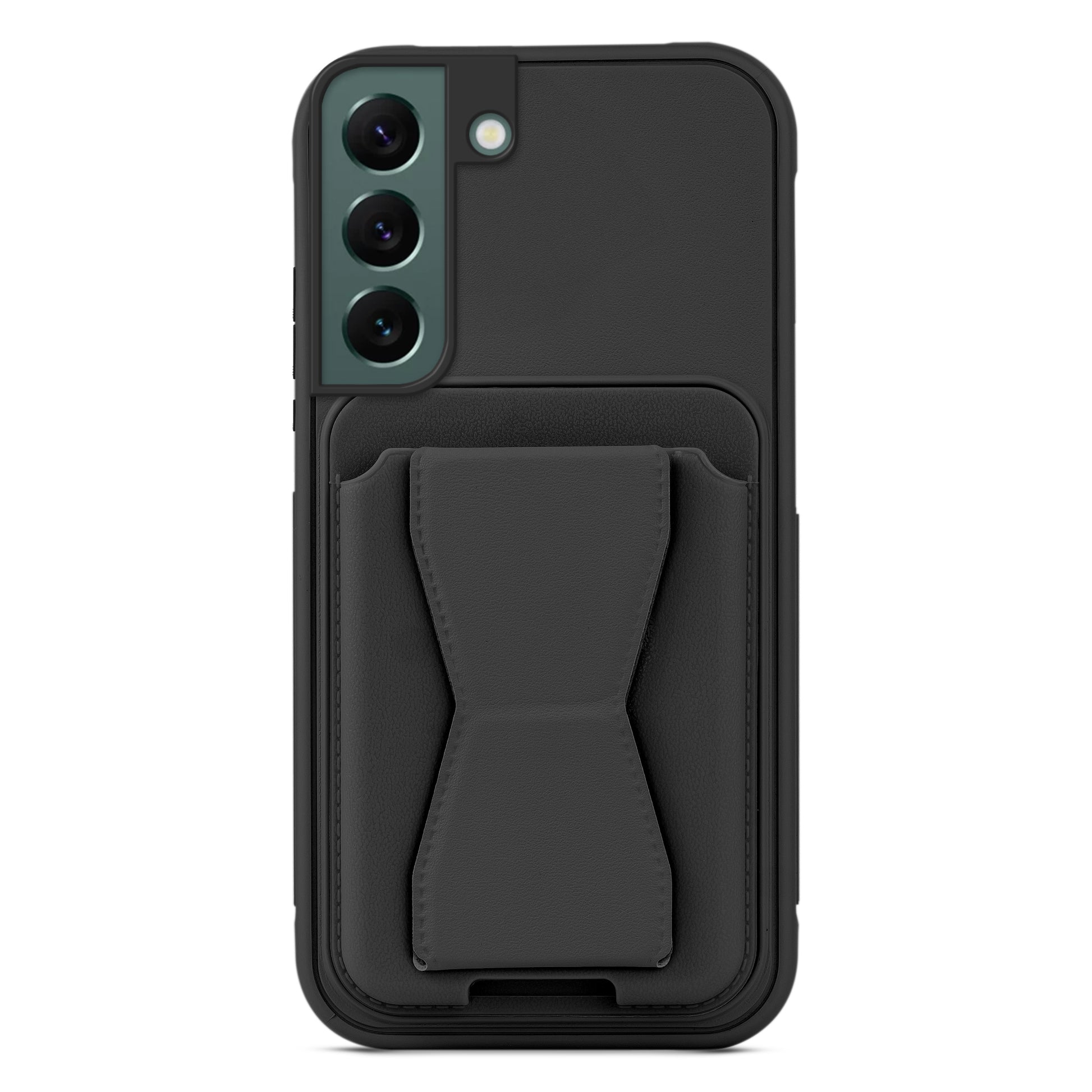 All in One Premium Leather Back Cover for Samsung S22 5G with Card Slot & Foldable Grip Holder