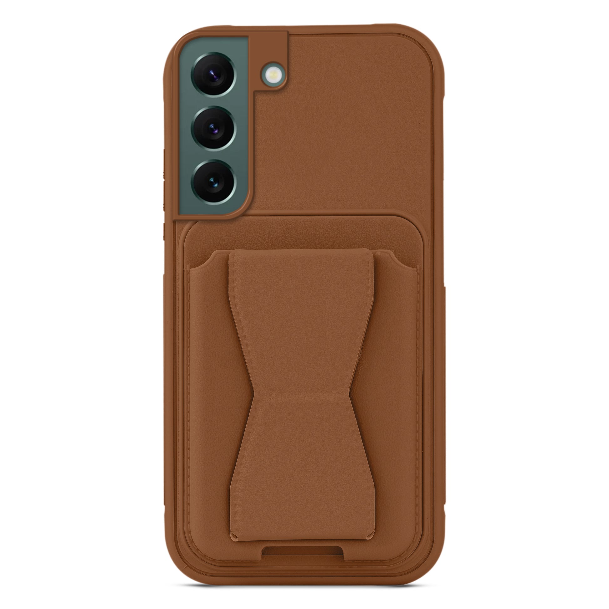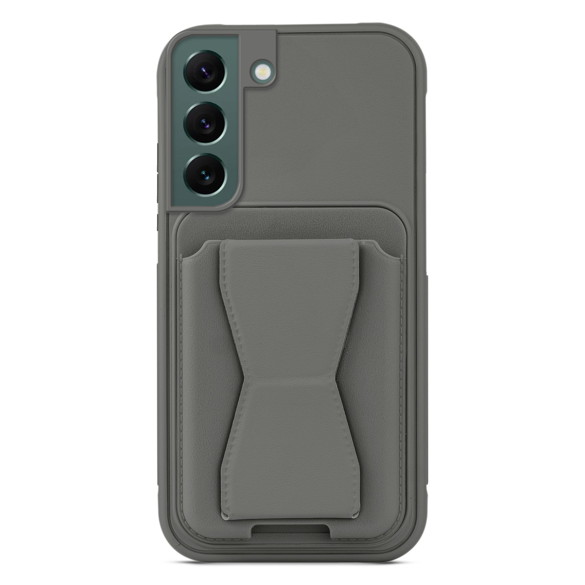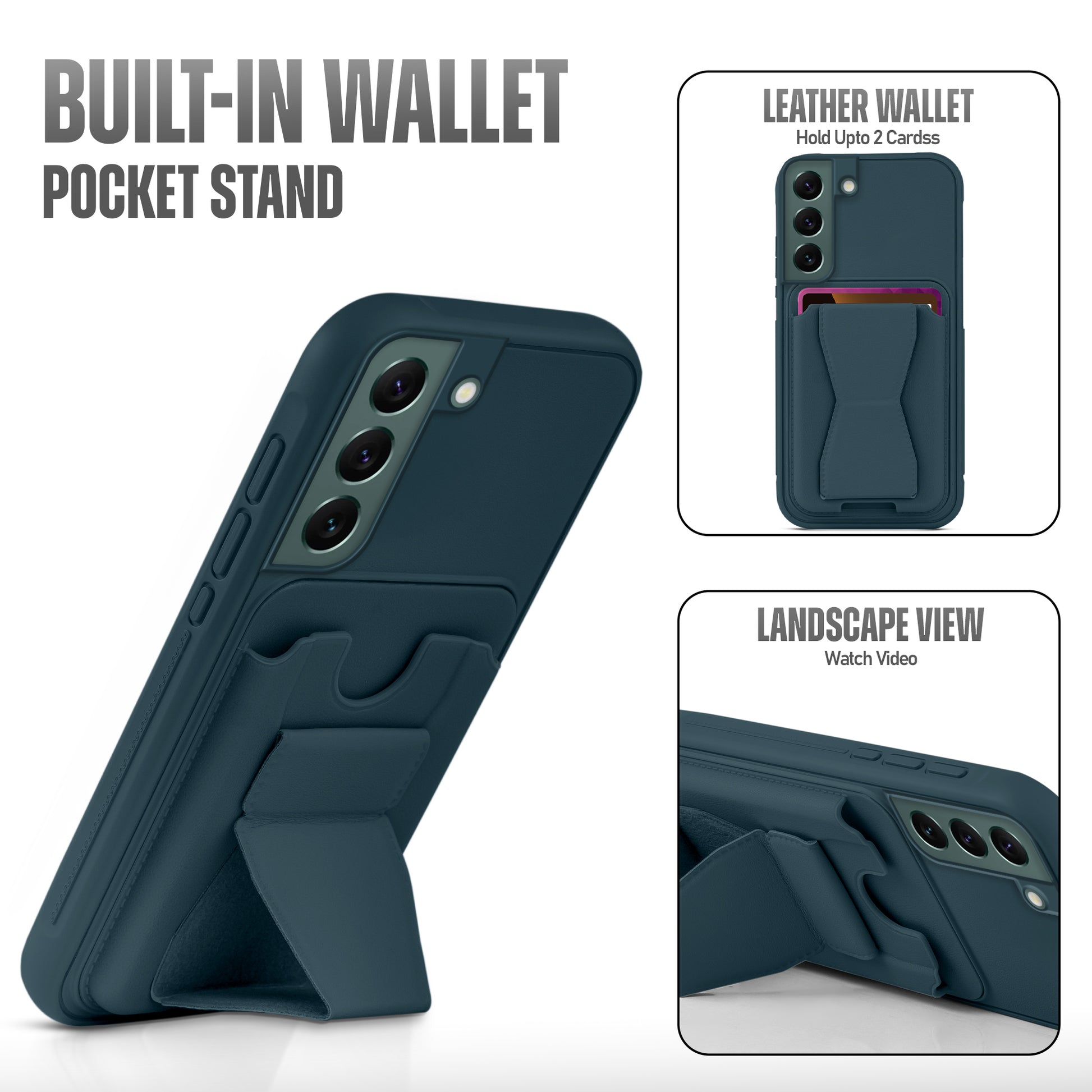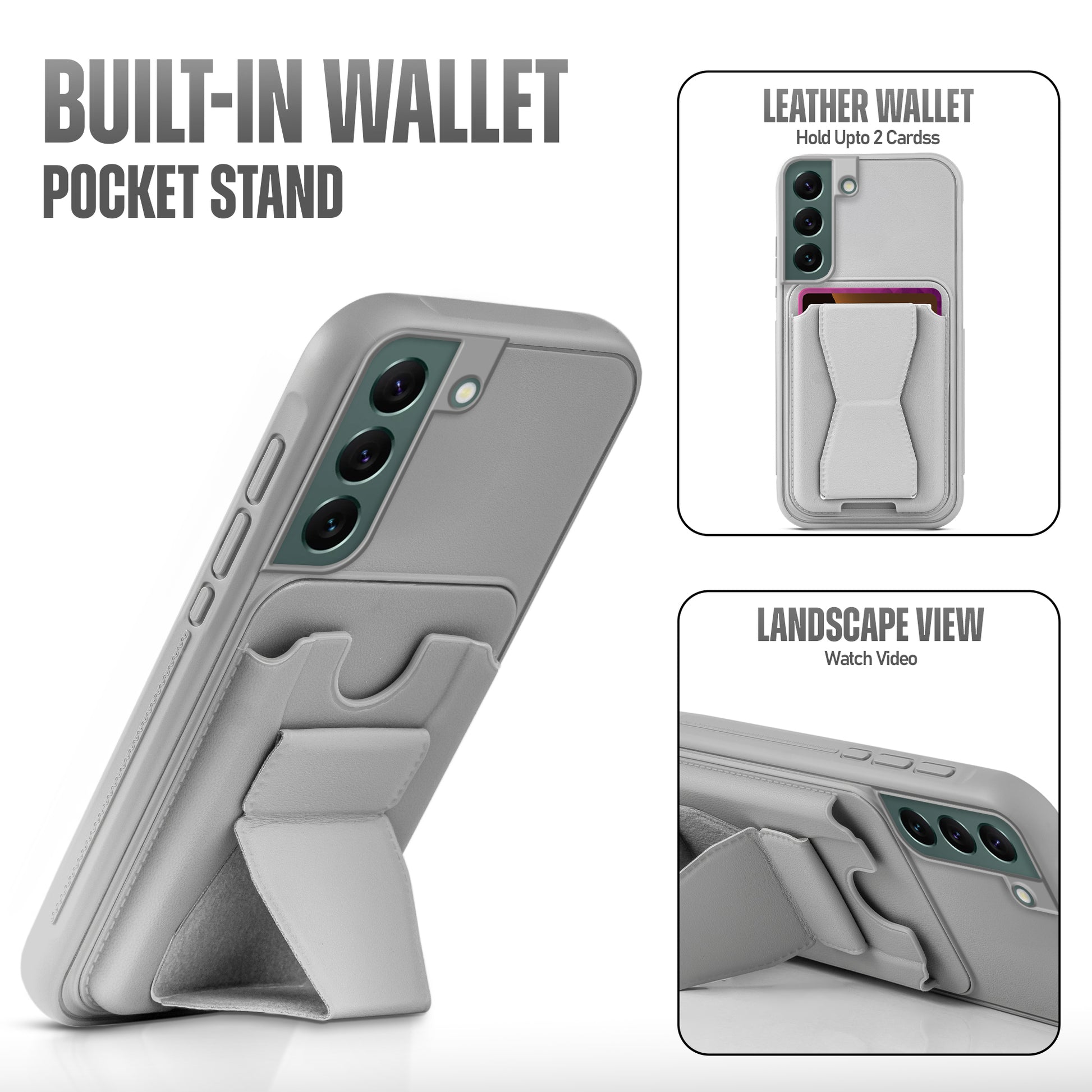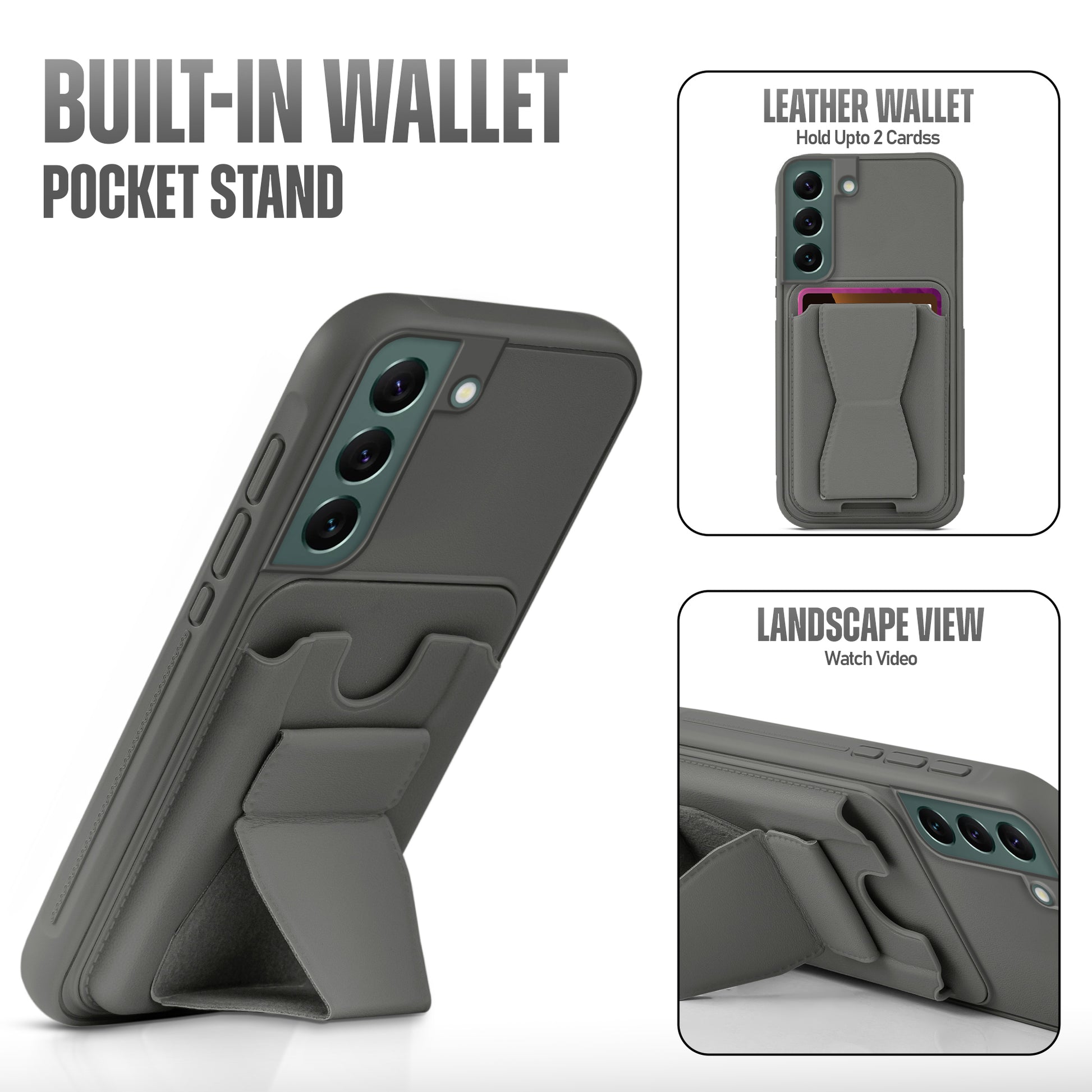 All in One Premium Leather Back Cover for Samsung S22 5G with Card Slot & Foldable Grip Holder