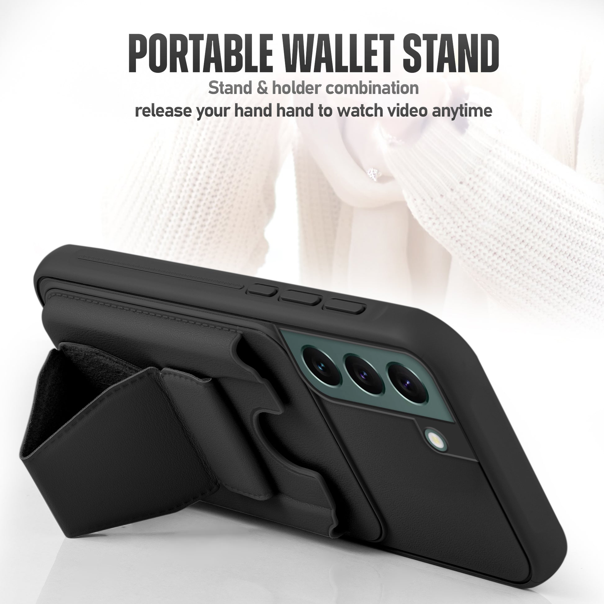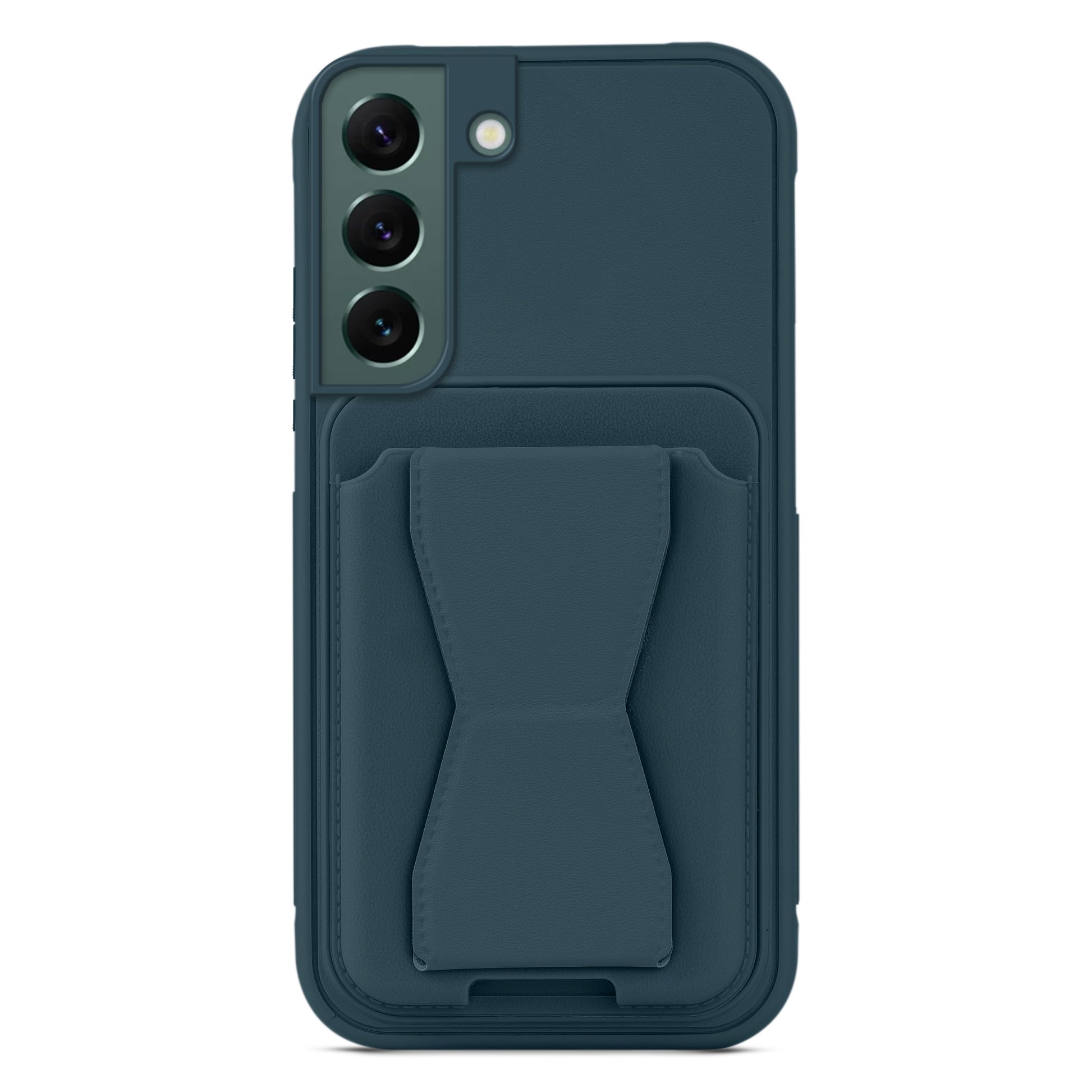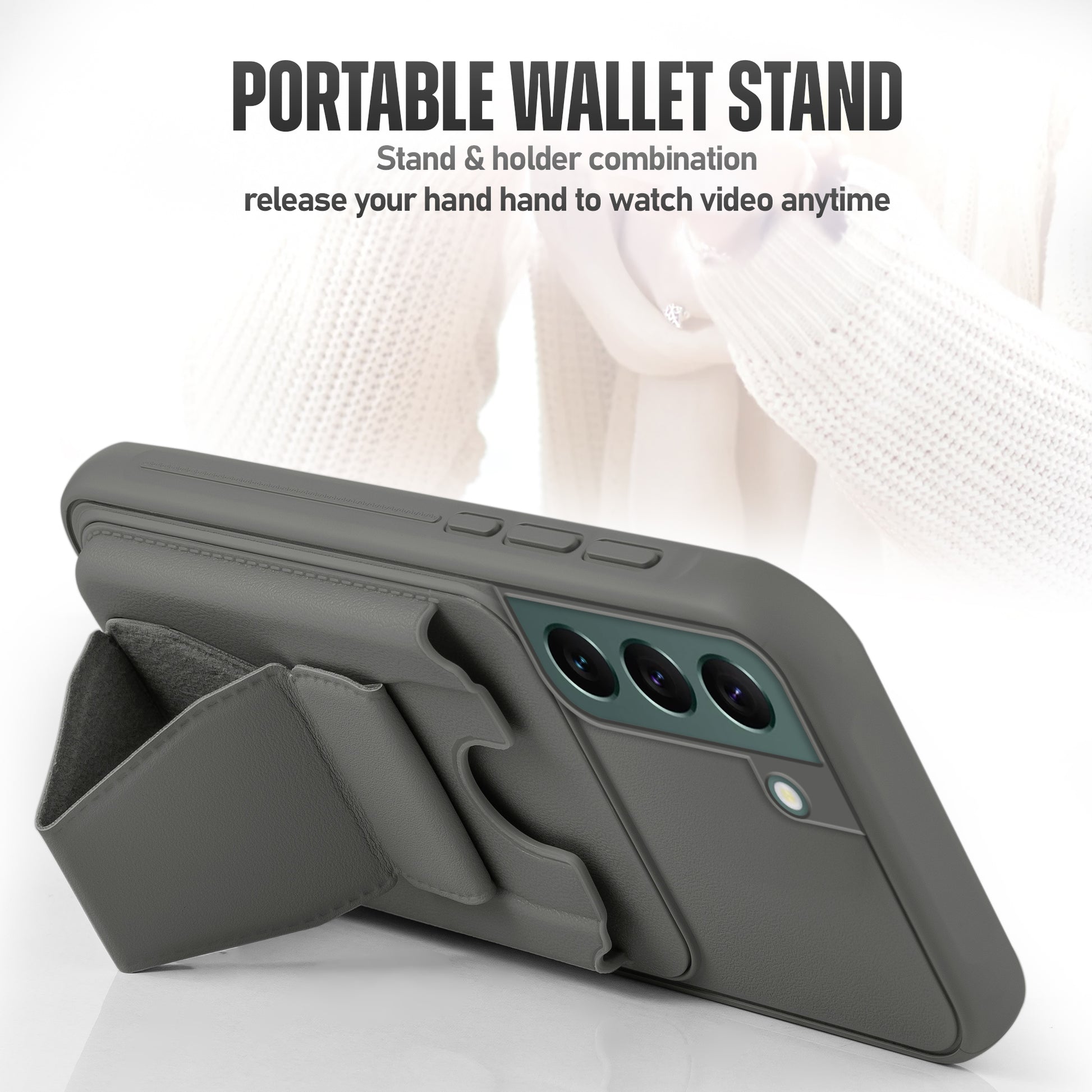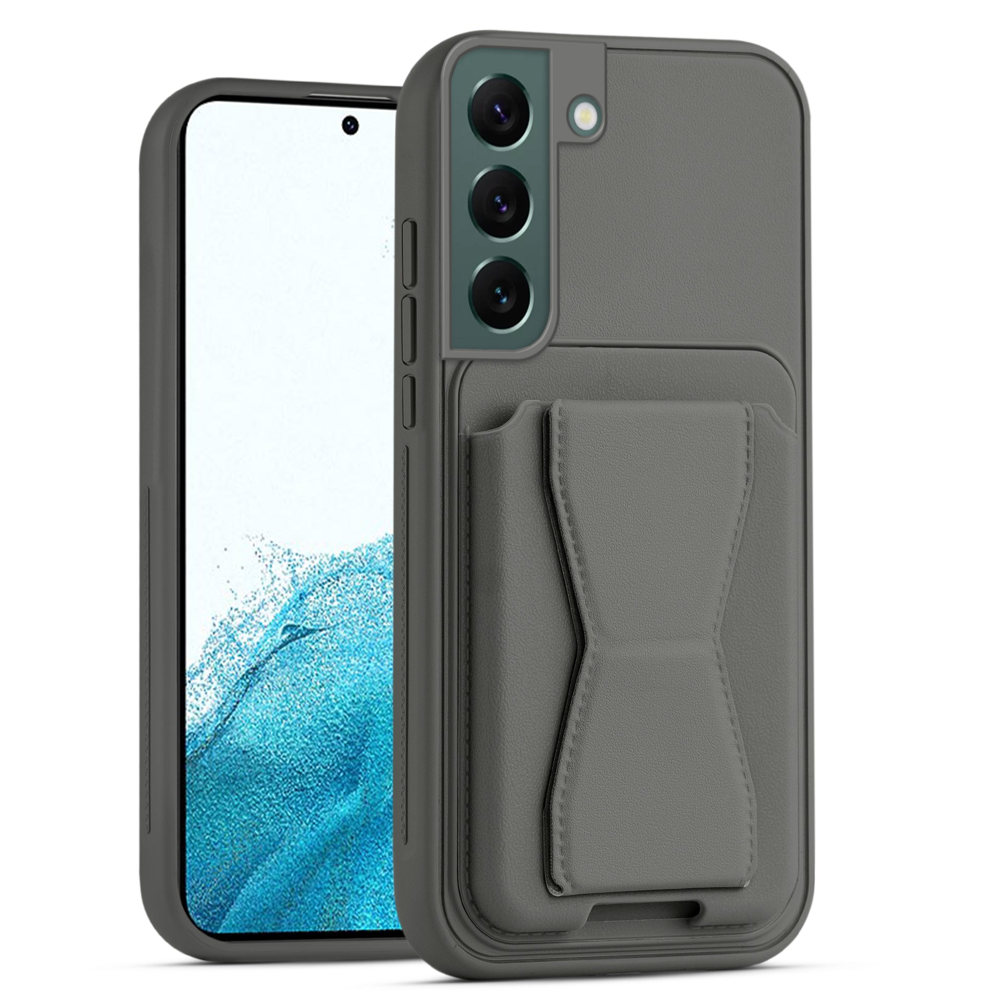 All in One Premium Leather Back Cover for Samsung S22 5G with Card Slot & Foldable Grip Holder