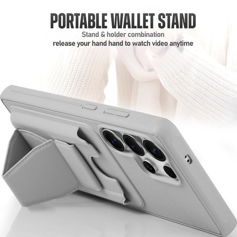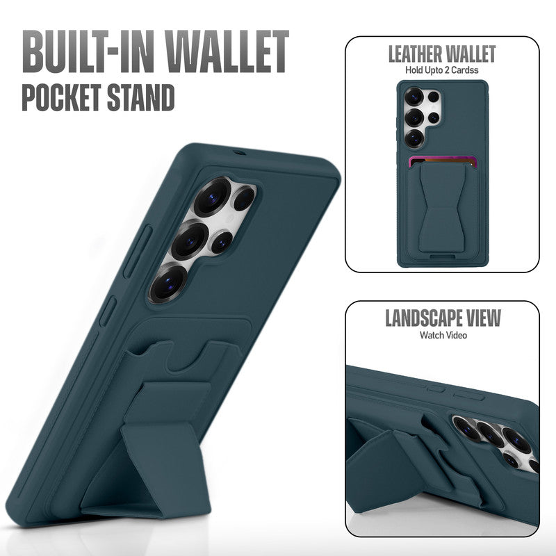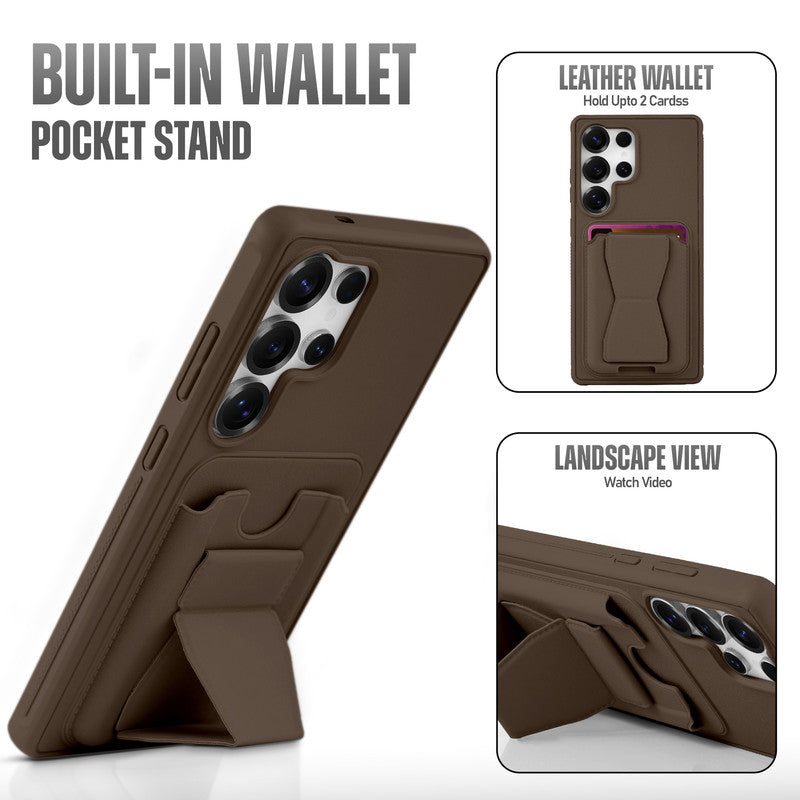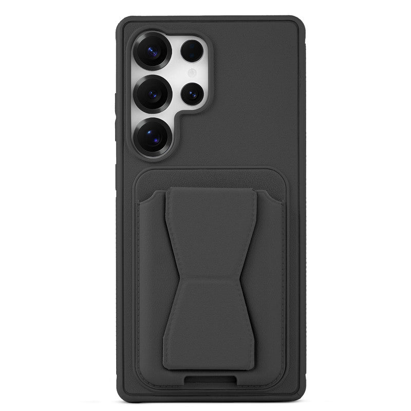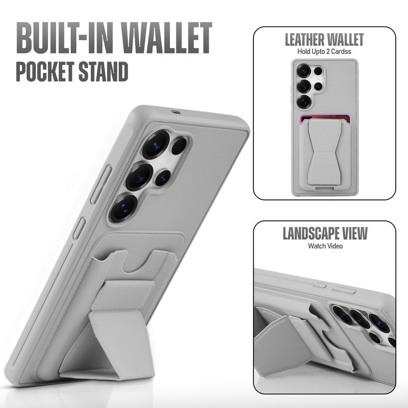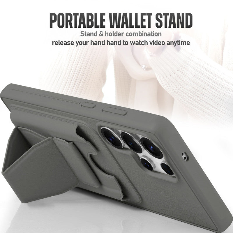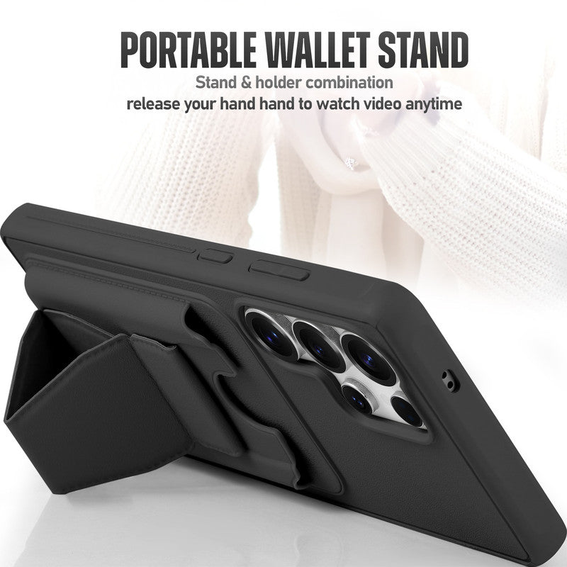 All in One Premium Leather Back Cover for Samsung S24 Ultra 5G with Card Slot & Foldable Grip Holder