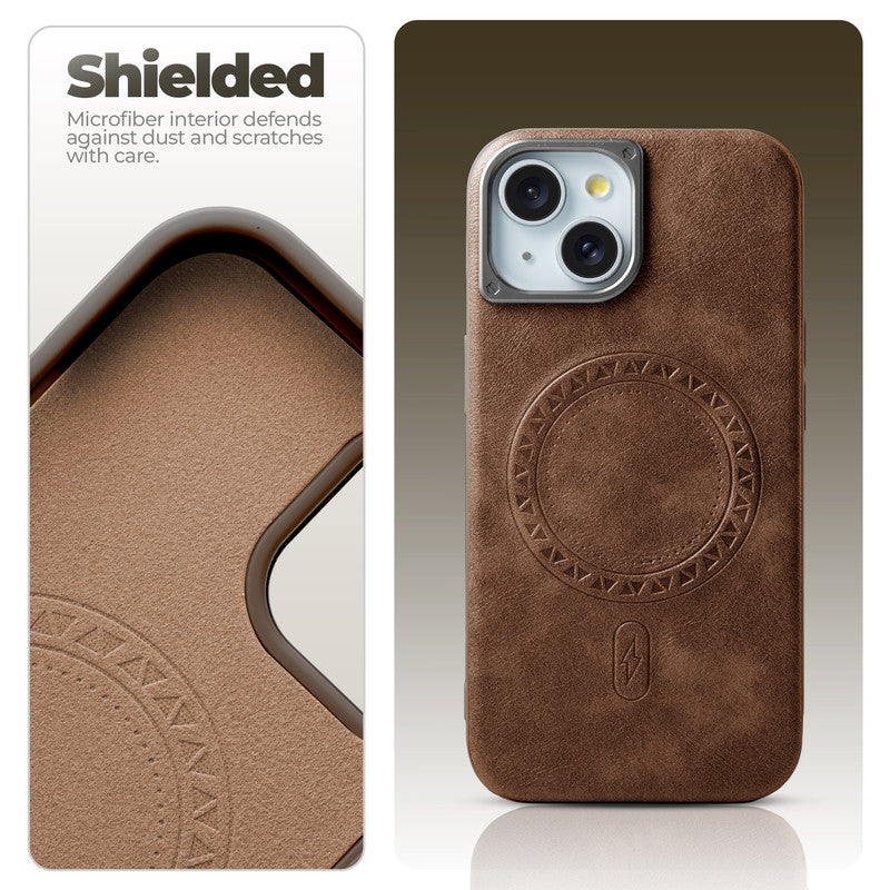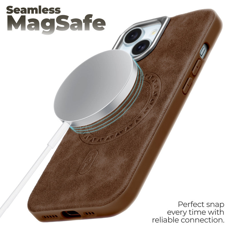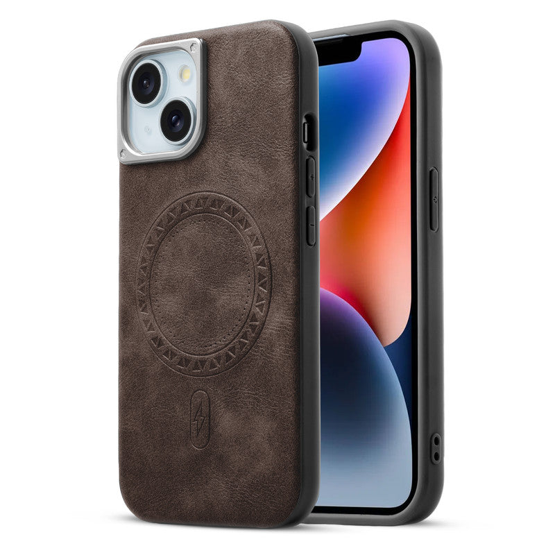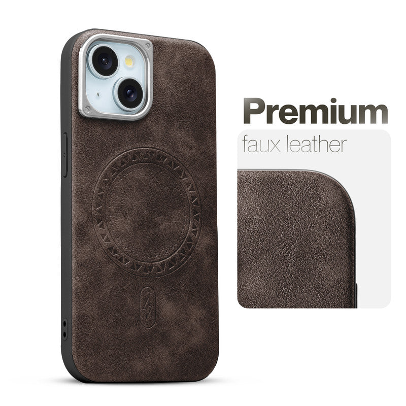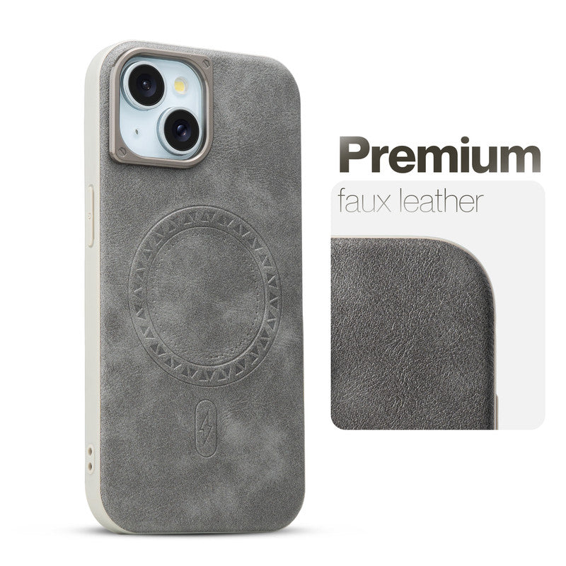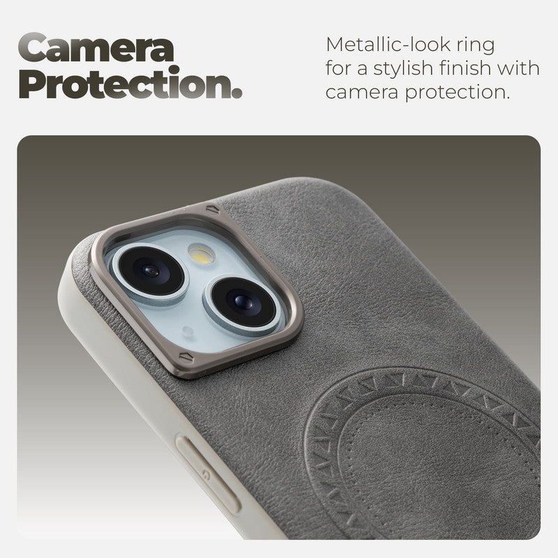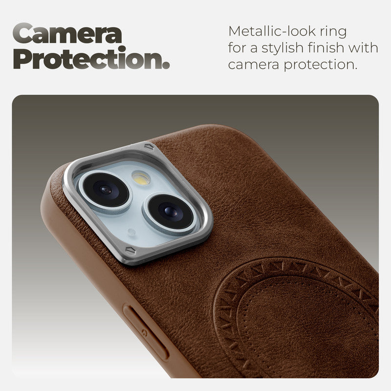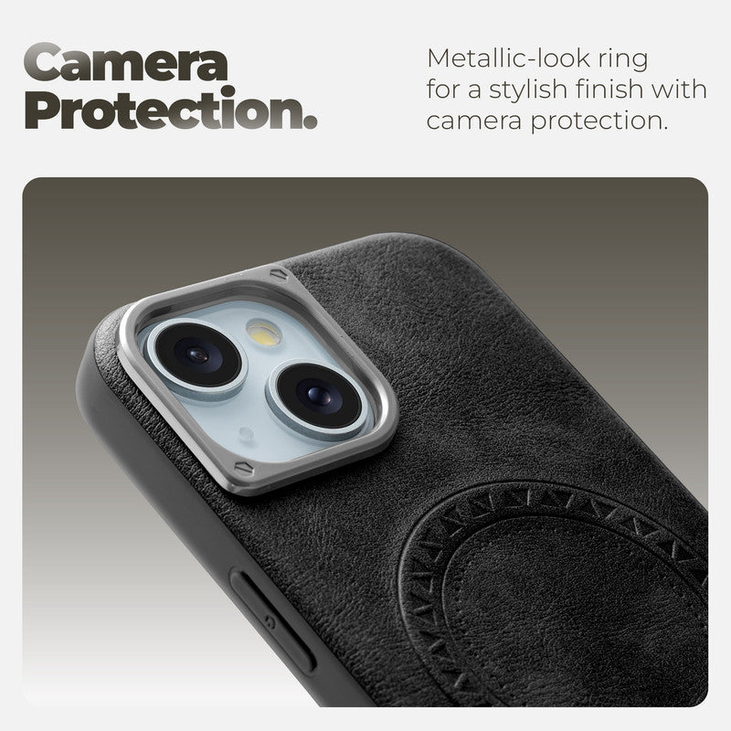Alloy Camera Ring Faux Leather Back Case for Apple iPhone 14 , Hard Shell with MagSafe Support