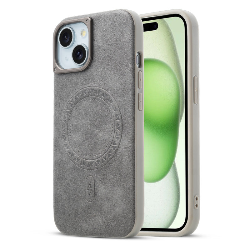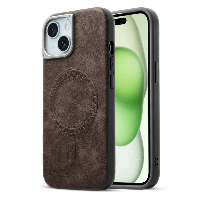 Alloy Camera Ring Faux Leather Back Case for Apple iPhone 15 Plus , Hard Shell with MagSafe Support