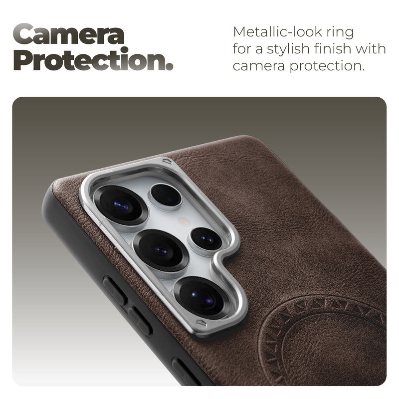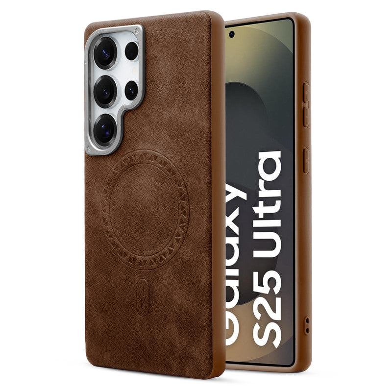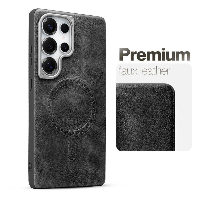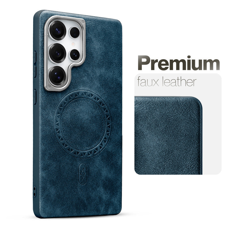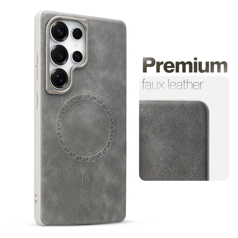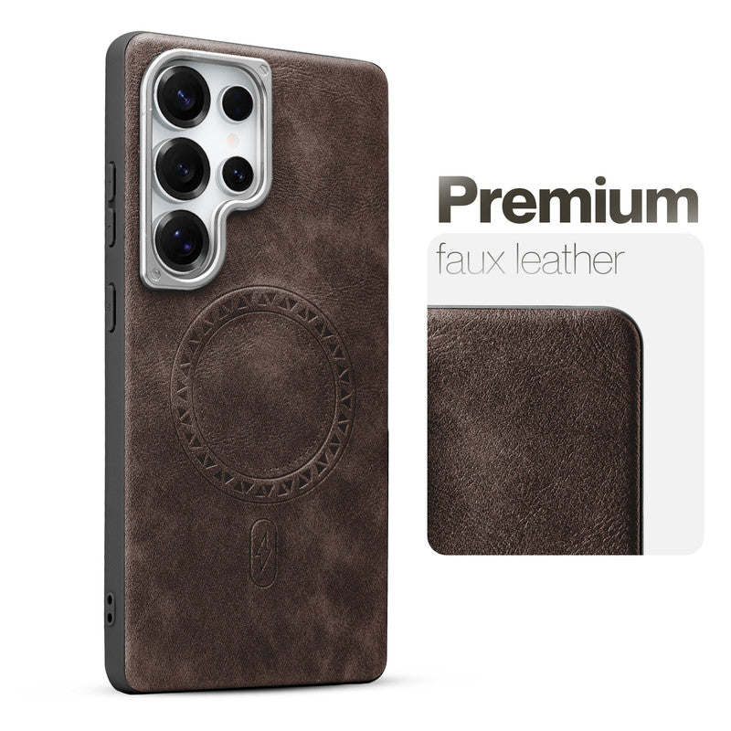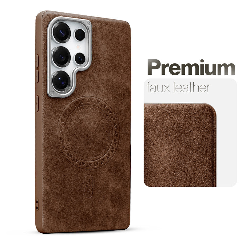 Alloy Camera Ring Faux Leather Back Case for Samsung S25 Ultra 5G , Hard Shell with MagSafe Support