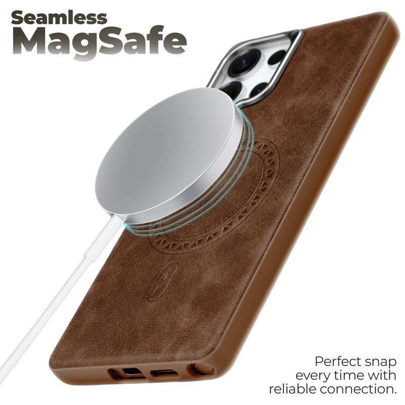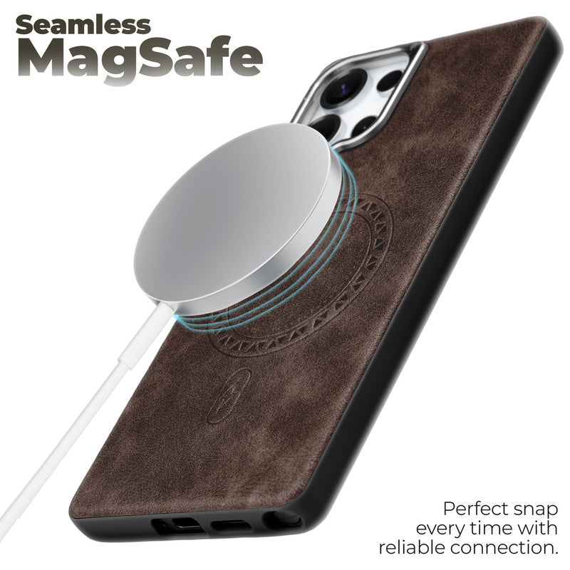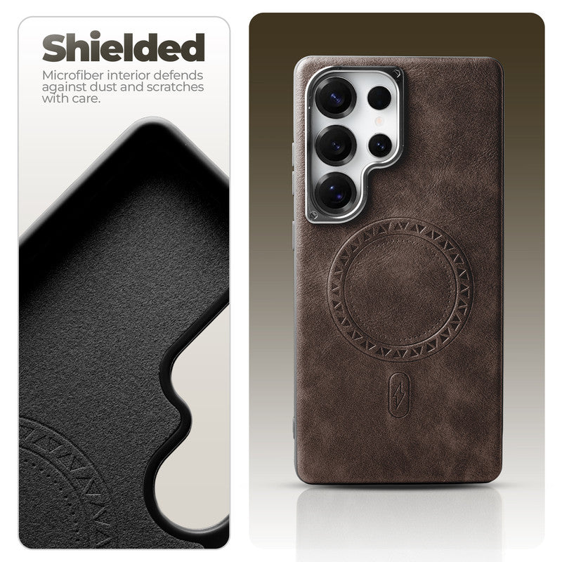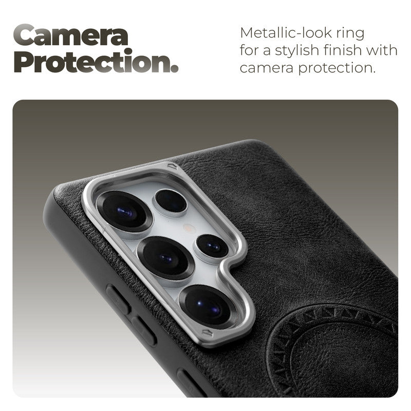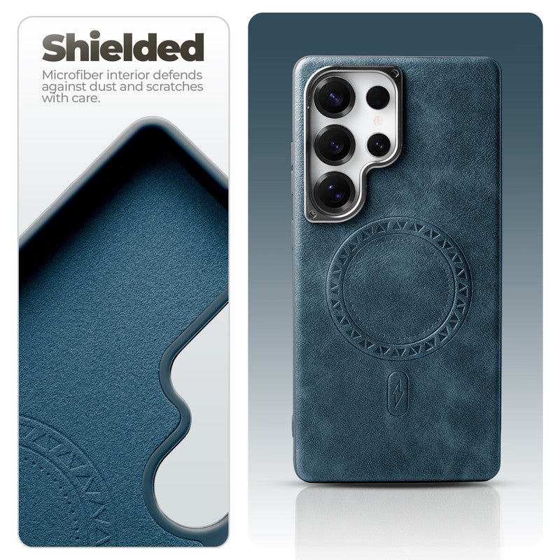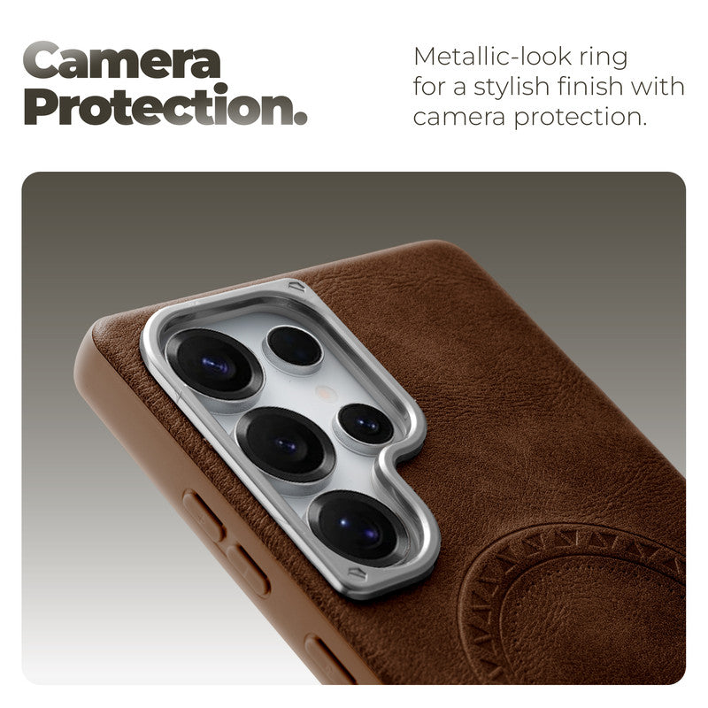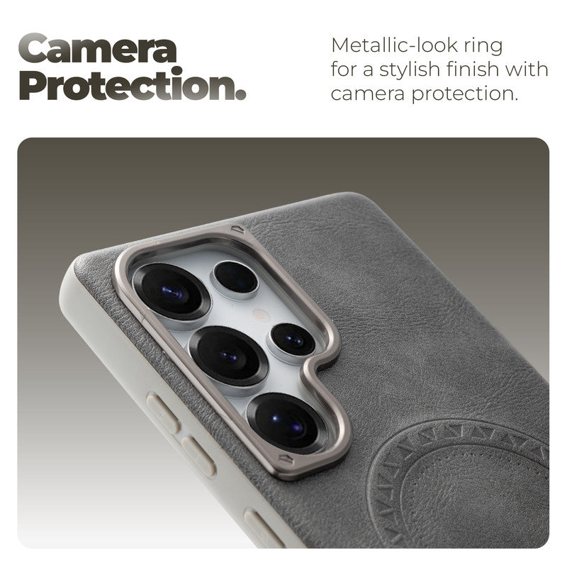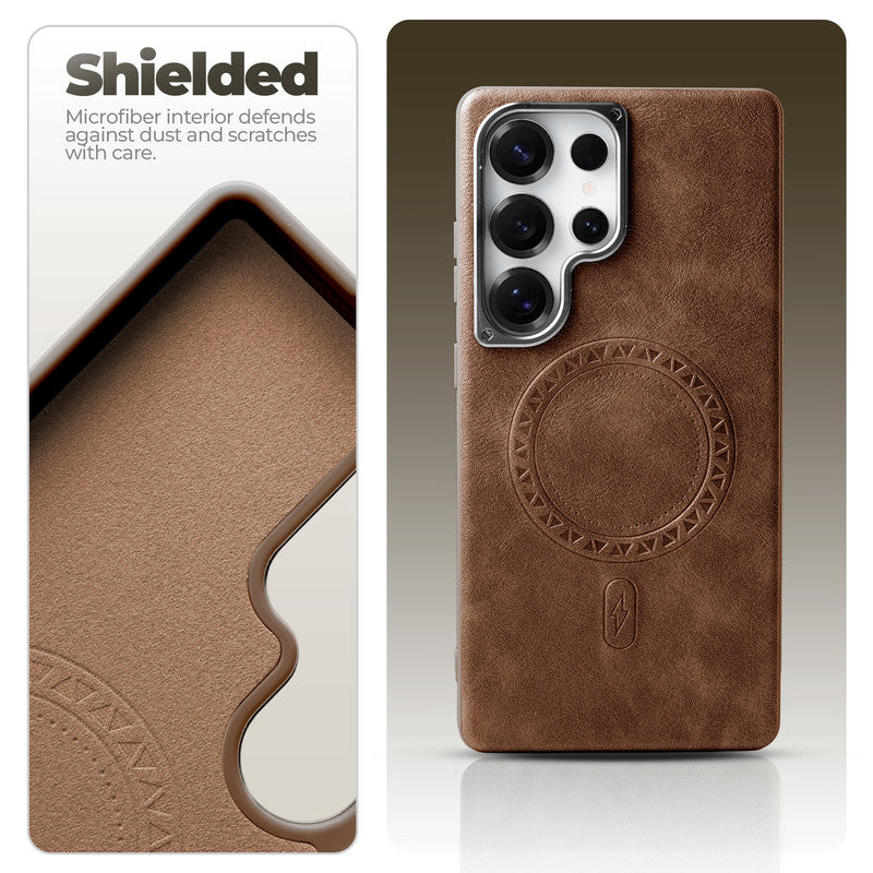 Alloy Camera Ring Faux Leather Back Case for Samsung S25 Ultra 5G , Hard Shell with MagSafe Support