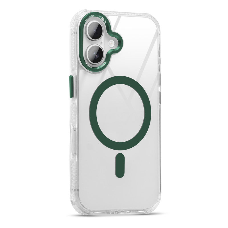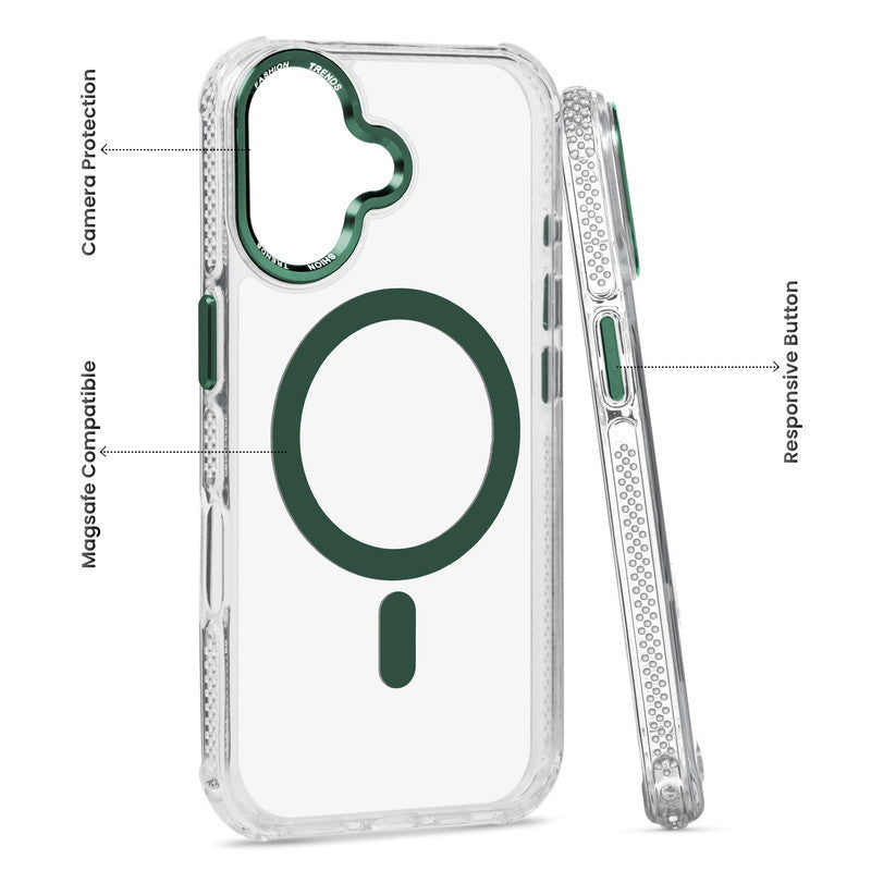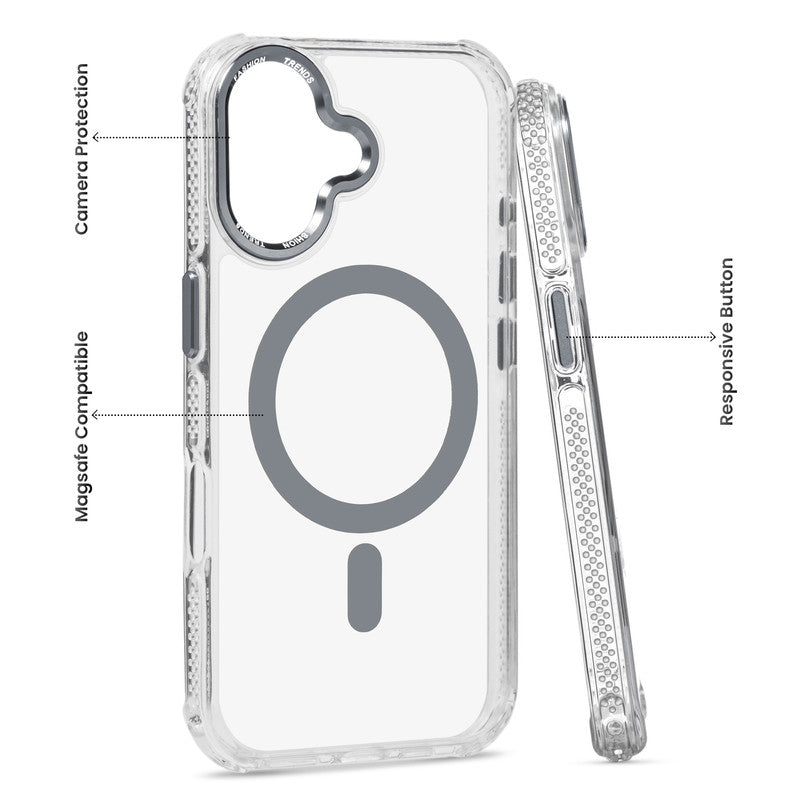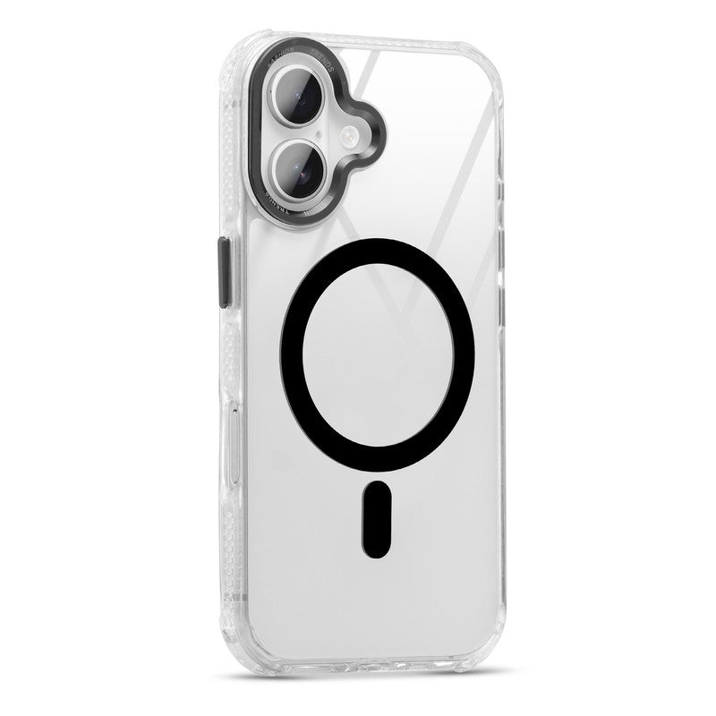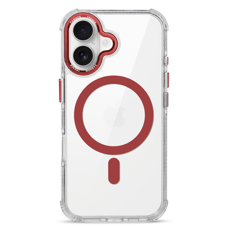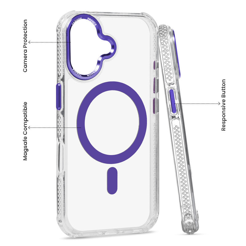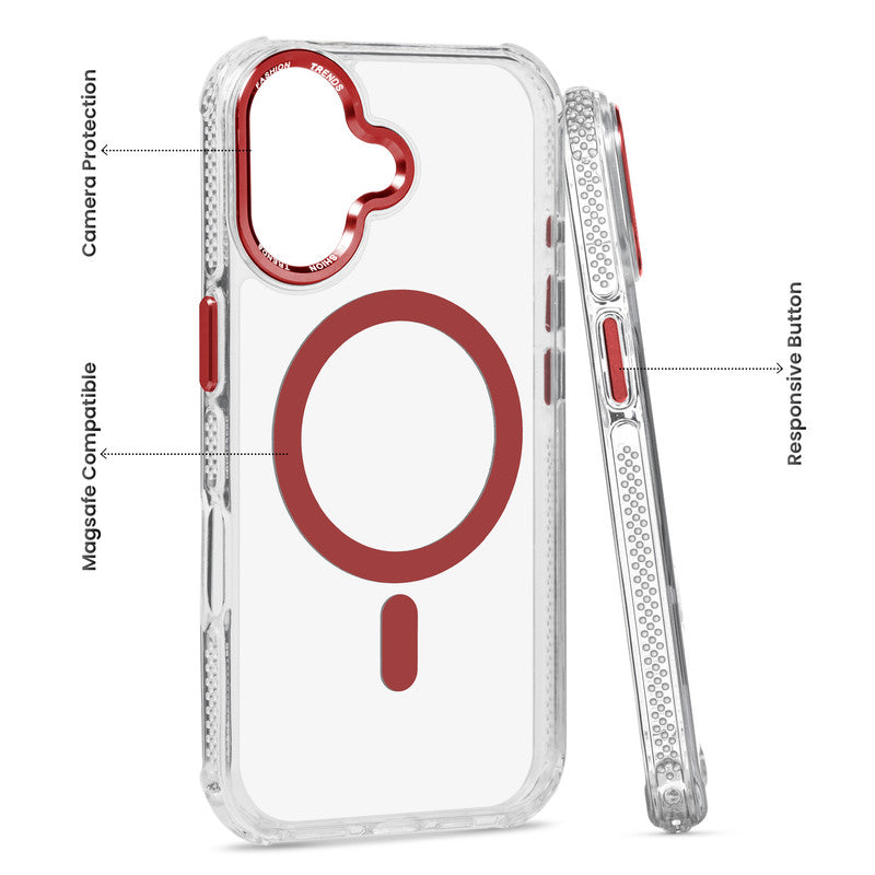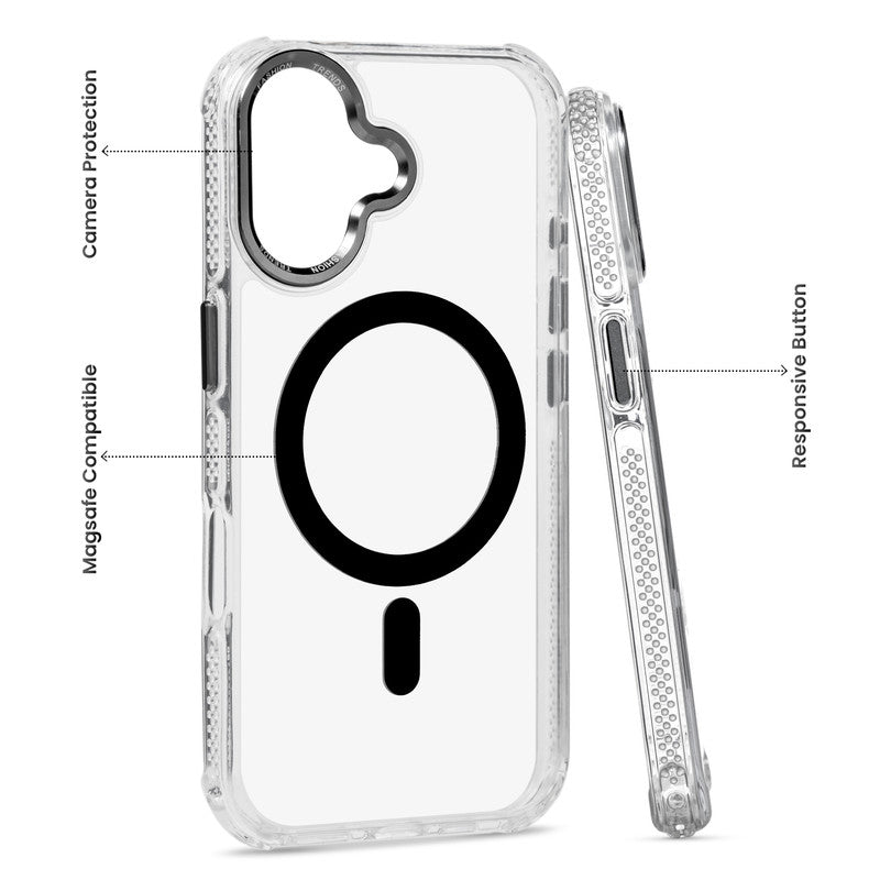 Premium Crystal Clear Hard Back Case For Apple iPhone 16 with Strong MagSafe Magnet & Colored Metal finish Ring Camera Protection